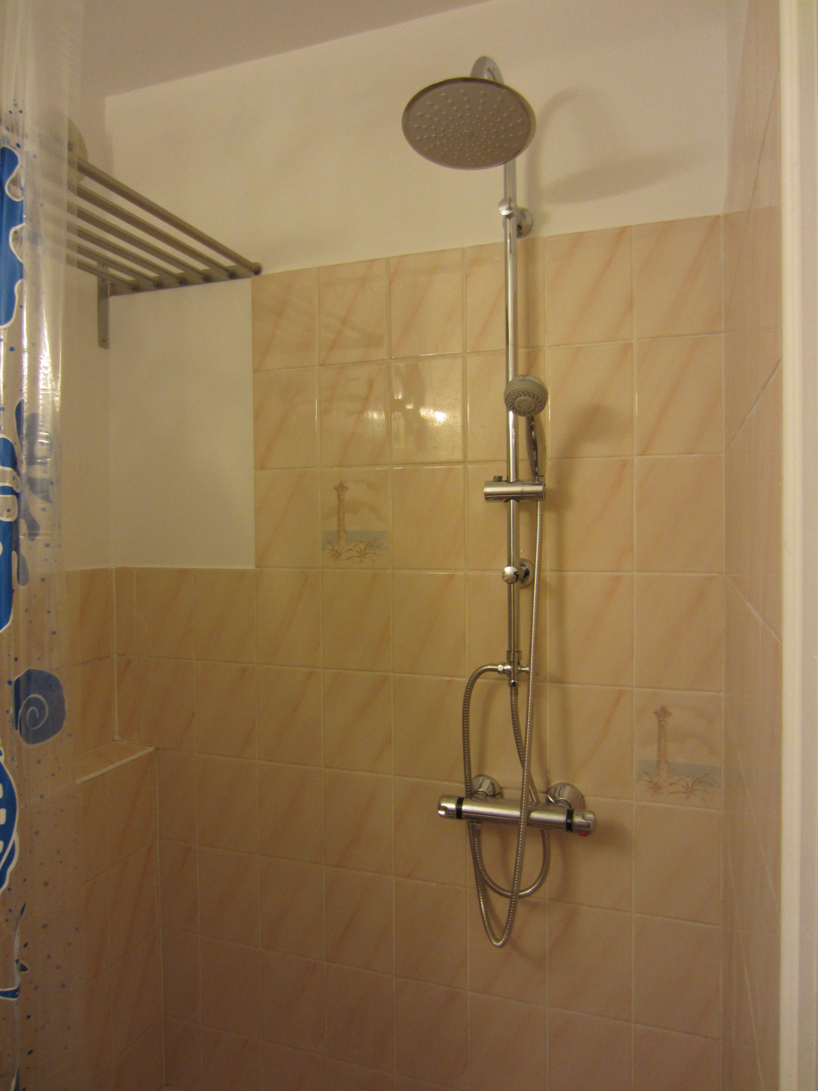 Salle de bain avec douche et wc, étagères, kitchenette séparée, chauffage électrique rayonnant, wifi incluse .